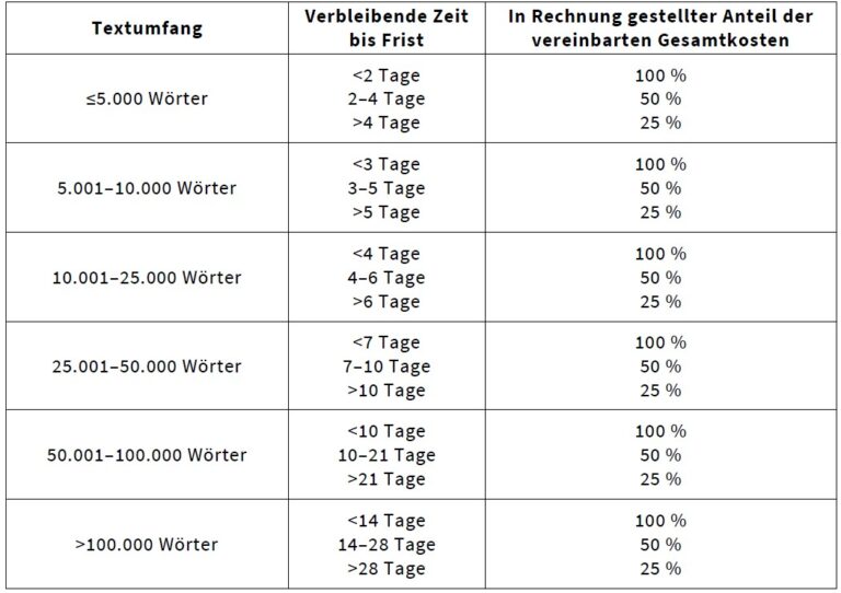- Falls ich zu Beginn des Auftrags feststellen muss, dass der Text umfangreicher ist als im Angebot festgehalten bzw. als ursprünglich vereinbart, behalte ich das Recht vor, das Angebot anzupassen bzw. einen neuen Preis und bei Bedarf auch eine neue Frist für die Umsetzung mit dem Kunden zu verhandeln. Ist der Umfang des Textes wie vereinbart und ich benötige dennoch länger als erwartet für die Umsetzung, trage ich hierfür die Verantwortung und berechne dem Kunden nicht mehr als die im Angebot vereinbarte Summe.
